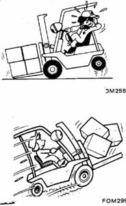• Evite los arranques, giros y paradas bruscos. Reduzca la velocidad al girar o cuando circula por superficies resbaladizas o desiguales que puedan hacer que el autoelevador vuelque o patine.